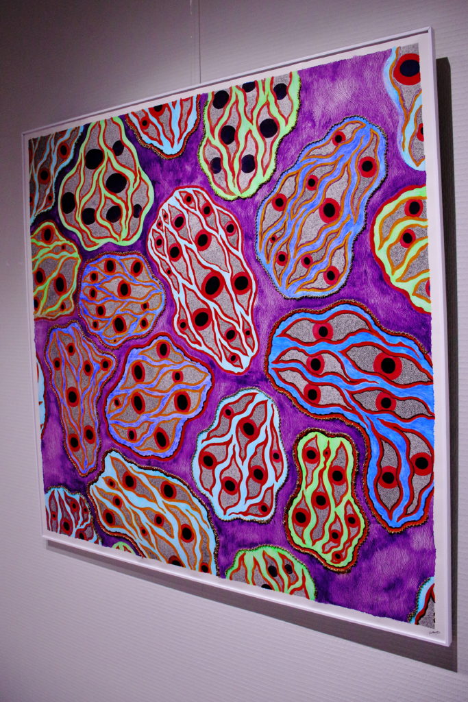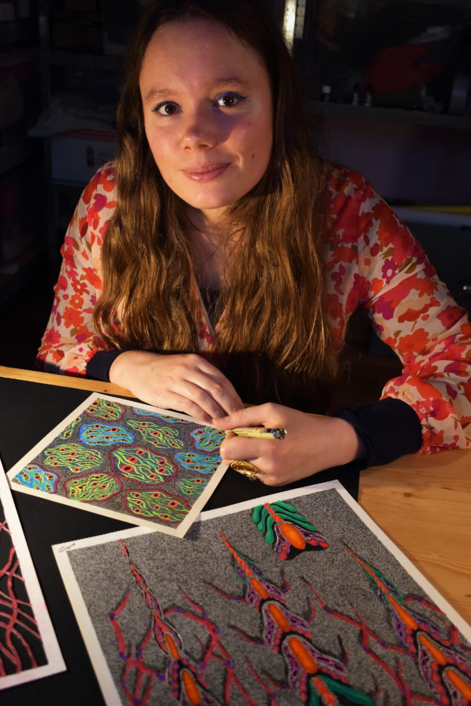 “Depuis son enfance, Lou Salamon explore avec fascination le monde du vivant. Dessinant insectes et végétaux, elle en scrute la structure cellulaire et s’imprègne des moindres frémissements de la nature qui l’entoure. Son besoin impulsif de créer fait partie de sa construction intime : son regard sur le monde se traduit par l’élaboration de matières textiles et organiques.