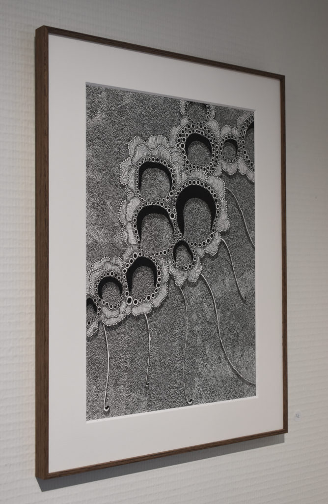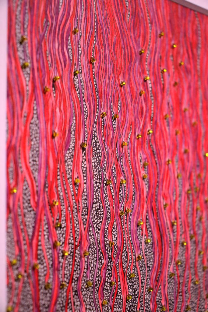 CP : Dans cette exposition, certaines oeuvres dialoguent avec des matériaux comme le verre (les perles). Comment ces associations vous permettent-elles d’explorer les contrastes entre eau et lumière, entre fluidité et rigidité ?
