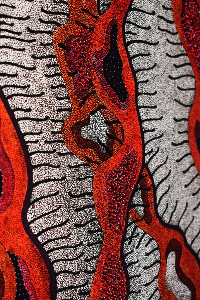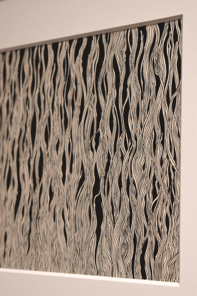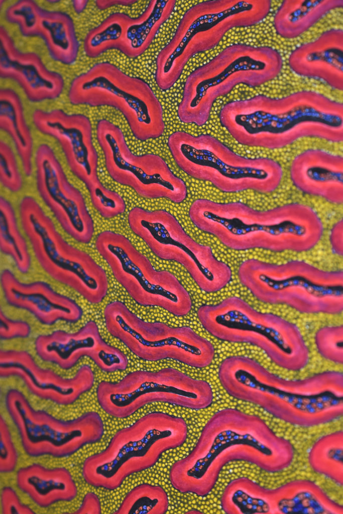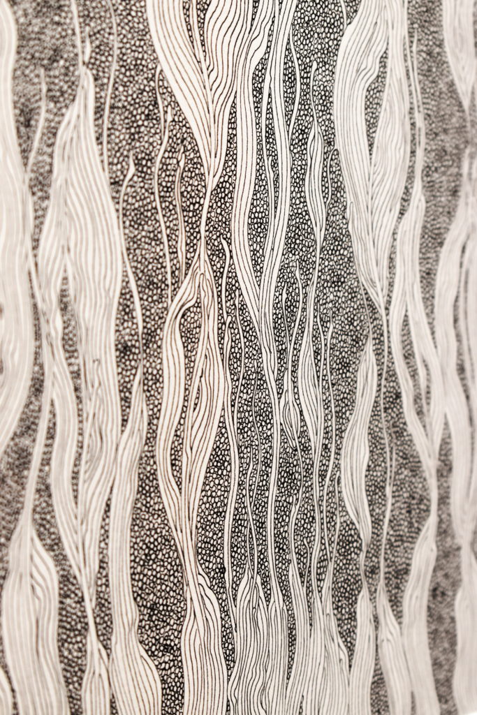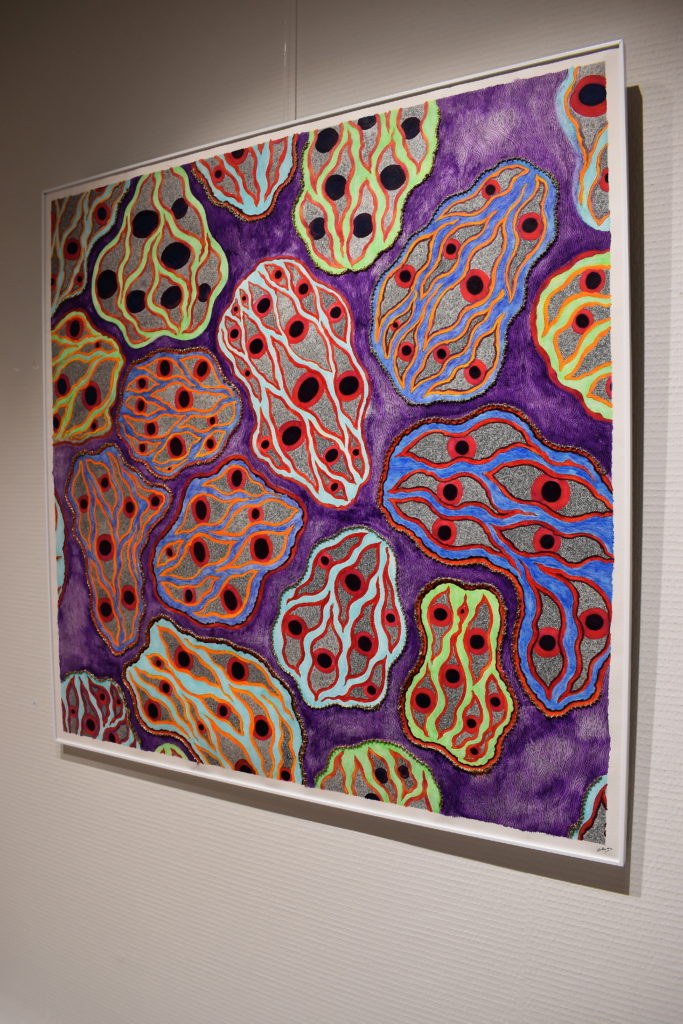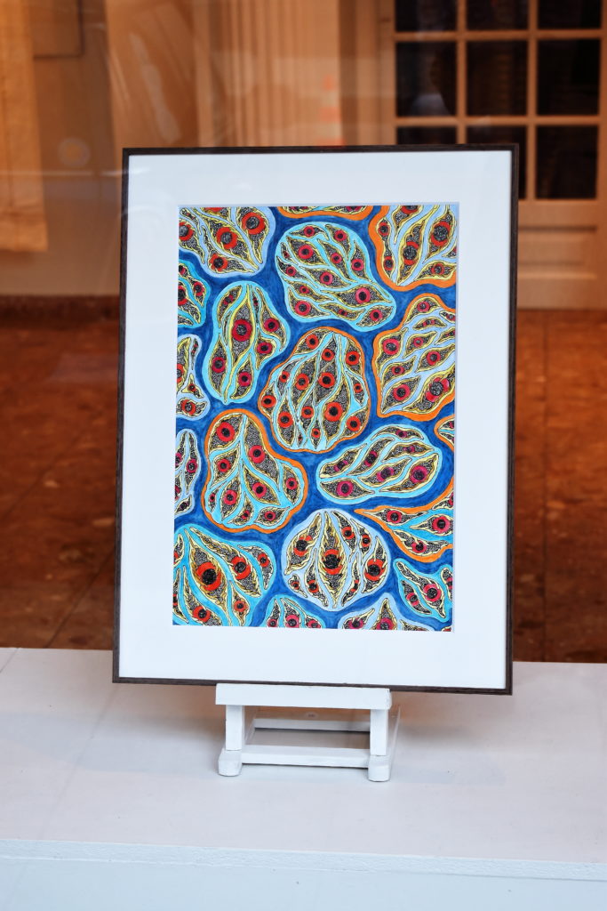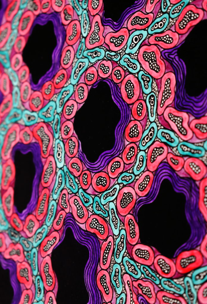 Lou : Je vis en Creuse, où la nature est parfois sauvage, libre et incontrôlée. J’observe minutieusement les mouvements de l’eau, reflets, couleurs et translucidités des lacs et rivières. Je m’imprègne énormément de ces paysages. Leurs couleurs très vives au printemps et leurs teintes chaudes aux reflets dorés de l’automne se retrouvent dans mes oeuvres. Par exemple, les couleurs des fleurs creusoises me rappellent les teintes des coraux et des anémones, et créent des ponts entre les différents domaines du vivant. Je côtoie également des naturalistes au quotidien dans mon cercle proche, et scrute des végétaux, champignons, amphibiens et oiseaux toutes les semaines, ce qui m’aide dans la création. Je me suis aussi énormément inspirées des photographies des abysses de Claire Nouvian, parues dans son livre Abysses . Mon travail est parfois suffocant de détails, dense, luxuriant, abondant, et cherche à représenter une profusion propre au vivant qui se duplique sans cesse, comme une symphonie colorée. C’est également pour cela que la notion de motif est très présente dans mes oeuvres : mes motifs dessinés à la main évoquent des cellules et des êtres qui se multiplient et se ressemblent, sans pour autant être des clones.