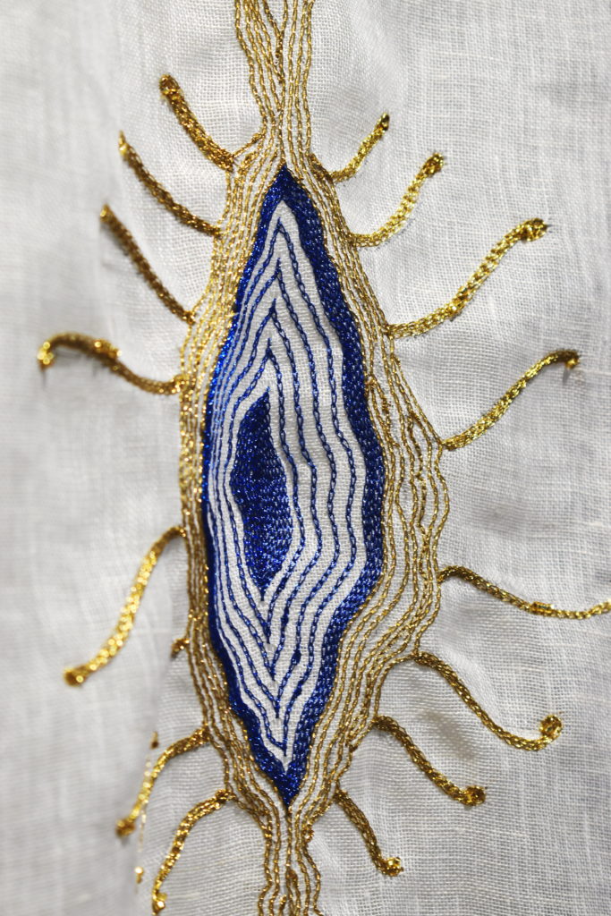 Lou : Le mouvement proche de la transe provoqué par la broderie provient de l’aspect répétitif du geste, régulier comme un battement de cœur, pratiqué pendant des heures et des heures, sans prendre de pause. Ainsi, l’art brodé devient hypnose. Dans la mythologie grecque, Dionysos est le dieu de la transe et sa danse est un art hypnotique des profondeurs, à l’inverse de l’art apollinien qui est relié à la clarté. Dans la musique de Dionysos, le rythme est prédominant, tandis que dans celle d’Apollon se sont les notes qui sont mises en valeur. La transe brodée est donc plus proche de la musique de Dionysos lorsque la broderie est réalisée de