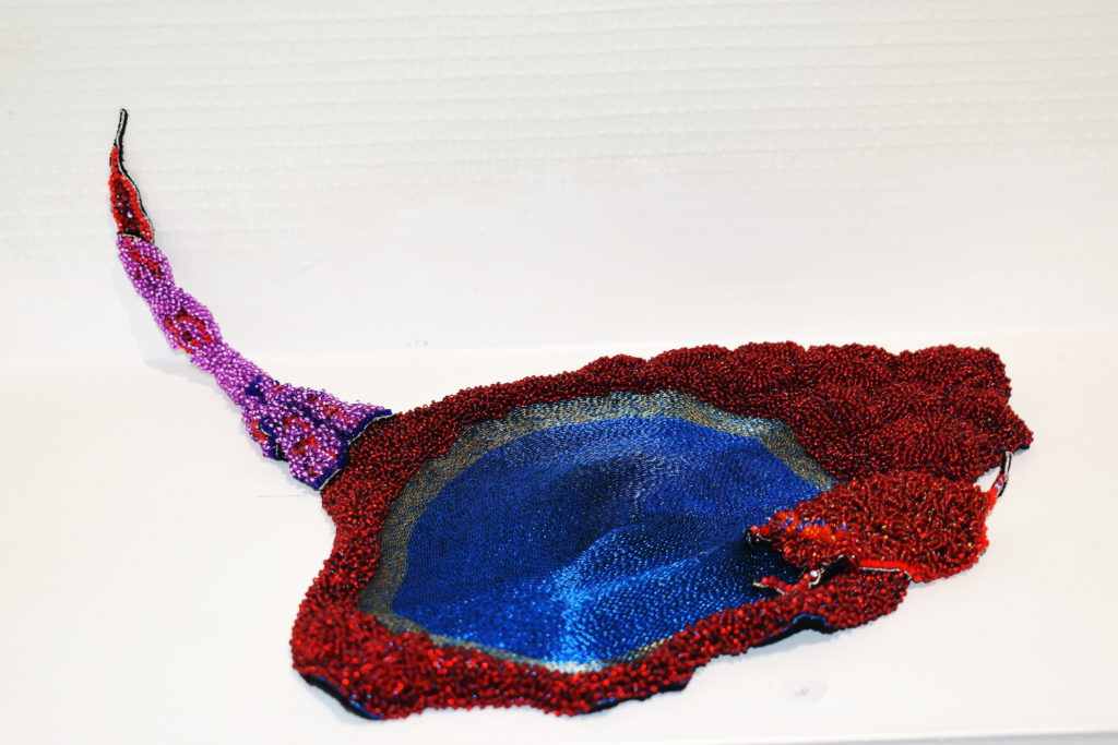Je cherche à ce que mes broderies évoquent à la fois des cellules, un univers aquatique et un ciel étoilé, et je joue pour cela sur la brillance des perles.