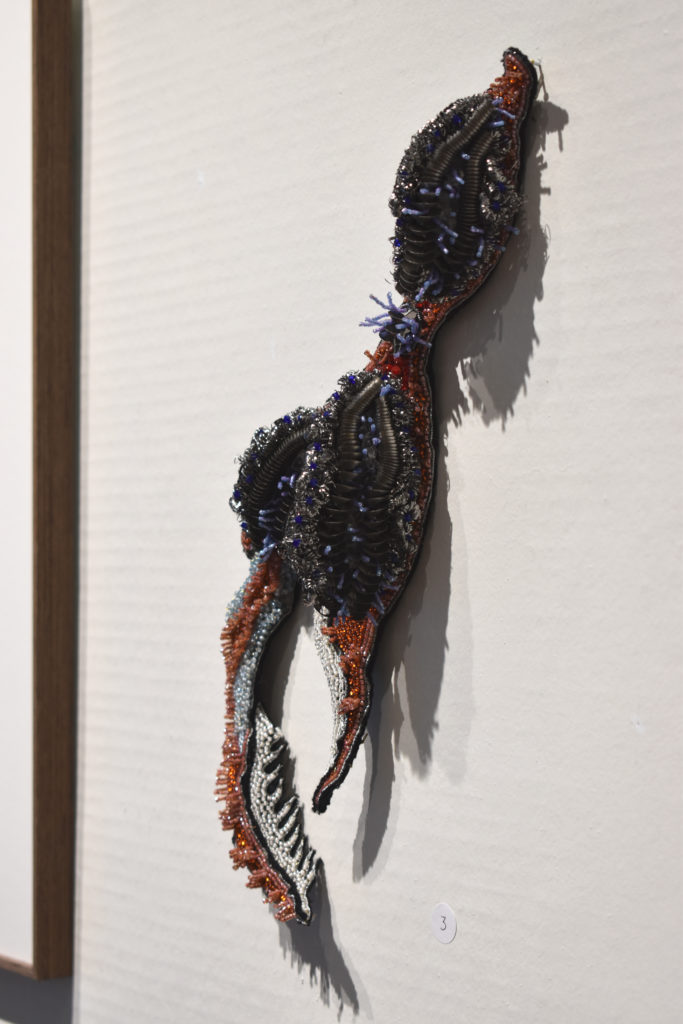 Lou : Les perles de verre évoquent à la fois le minéral et la brillance de l’eau au soleil ou au clair de lune. J’adapte ma technique selon la sensation recherchée. Pour du minéral, de la rigidité, je crée de la profusion, les perles brodées les unes sur les autres devenant l’évocation de couches géologiques. A l’inverse, pour suggérer de lu, les perles sont parsemées, disposées avec légèreté, comme de multiples petits reflets.