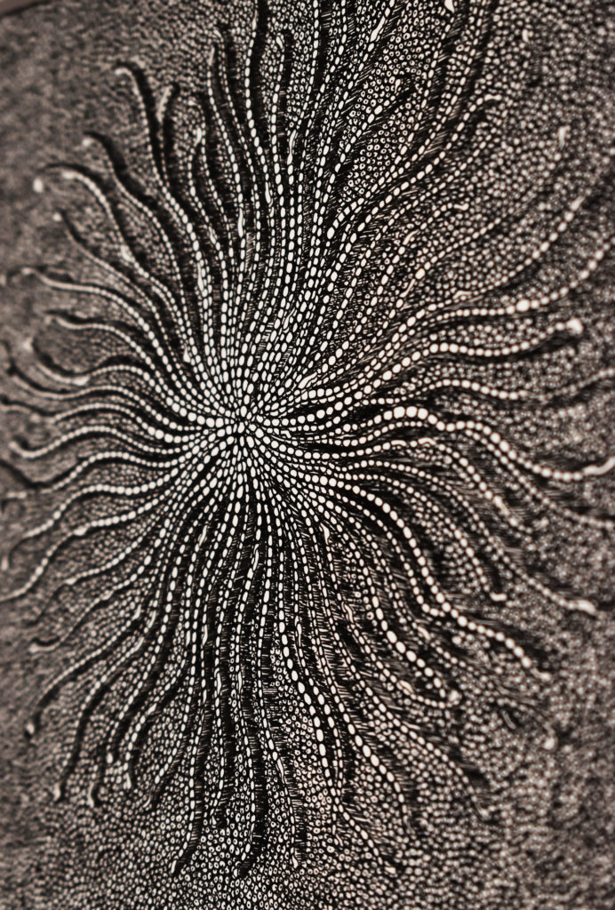 CP : Vous évoquez parfois la broderie comme une danse, une transe, un effacement de soi dans le geste. Comment cette dimension physique, presque performative, influence-t-elle vos oeuvres ? Ressentez-vous une différence entre broder un motif inspiré de l’eau et un motif inspiré de la lumière ?