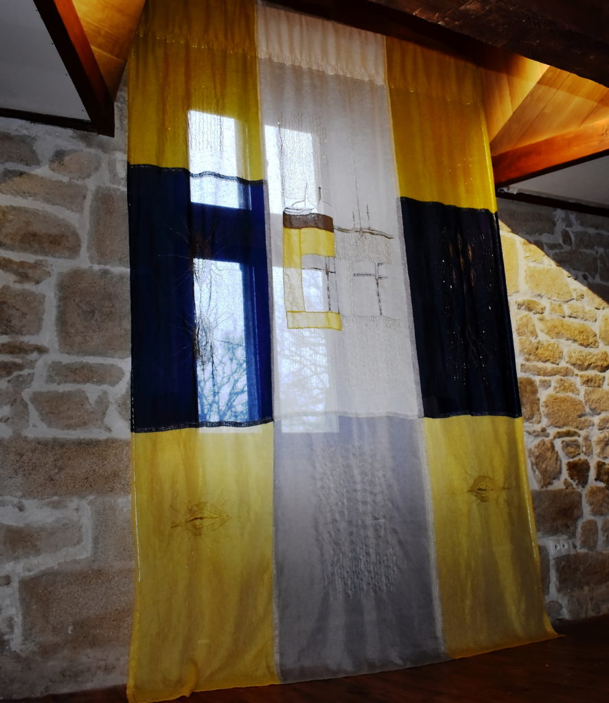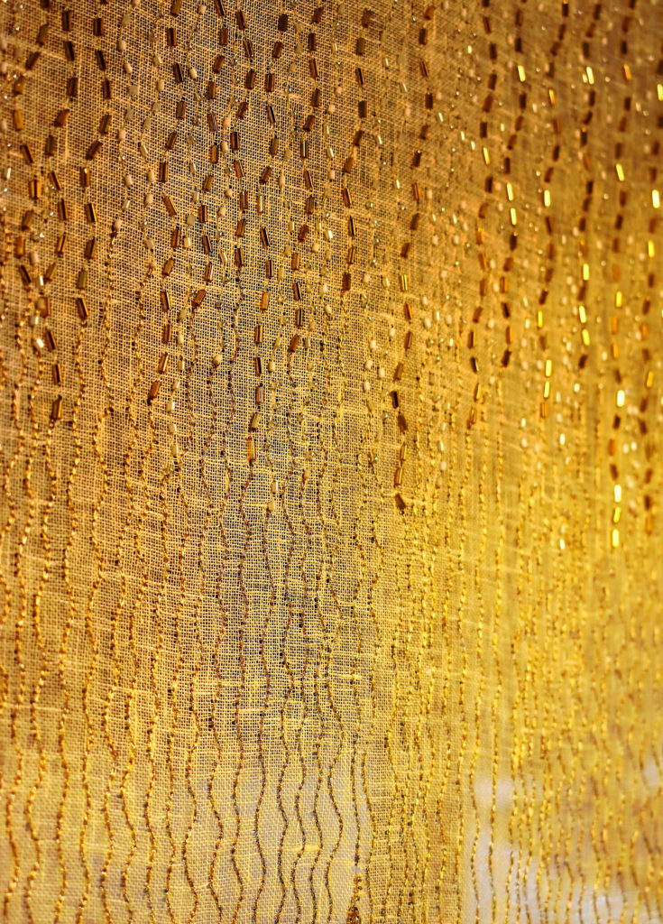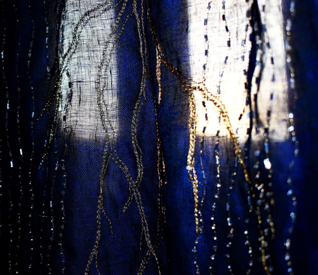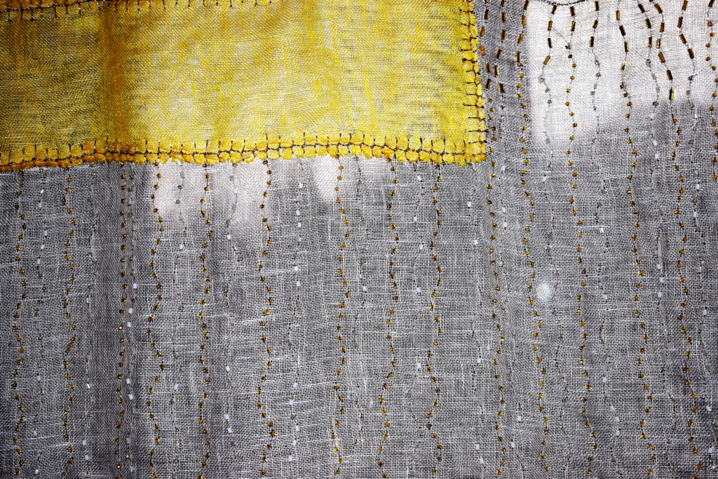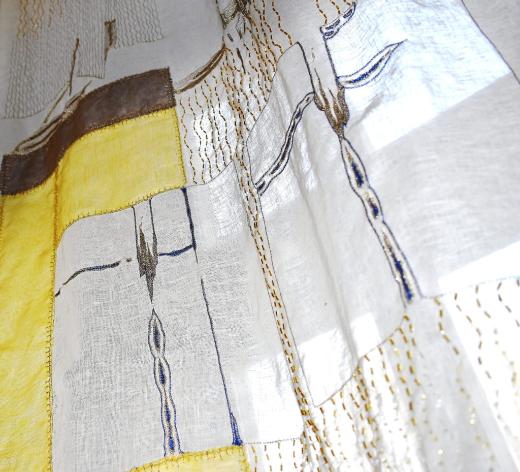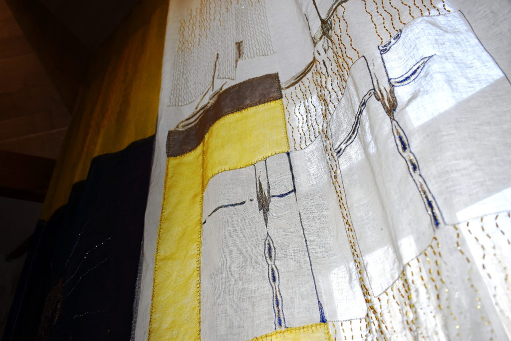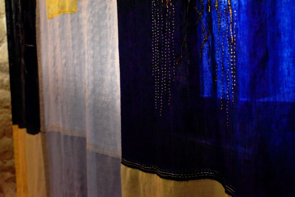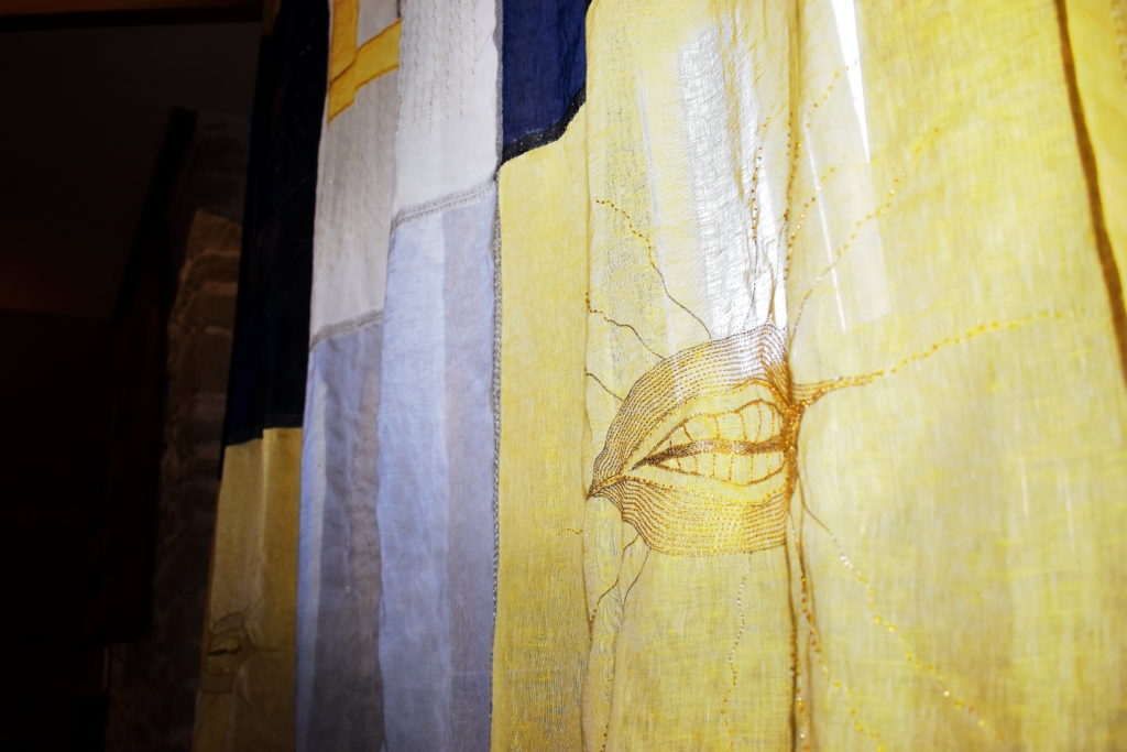 La broderie filtre la lumière à la manière d’un vitrail, et tisse des liens entre féminité et esthétiques catholiques et musulmanes. Celle-ci interagit avec la lumière naturelle : certaines broderies du “vitrail” apparaissent avec la tombée de la nuit, et d’autres se révèlent au regard lorsqu’il fait jour.