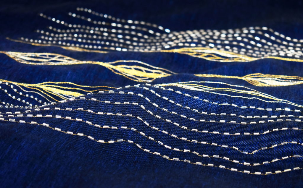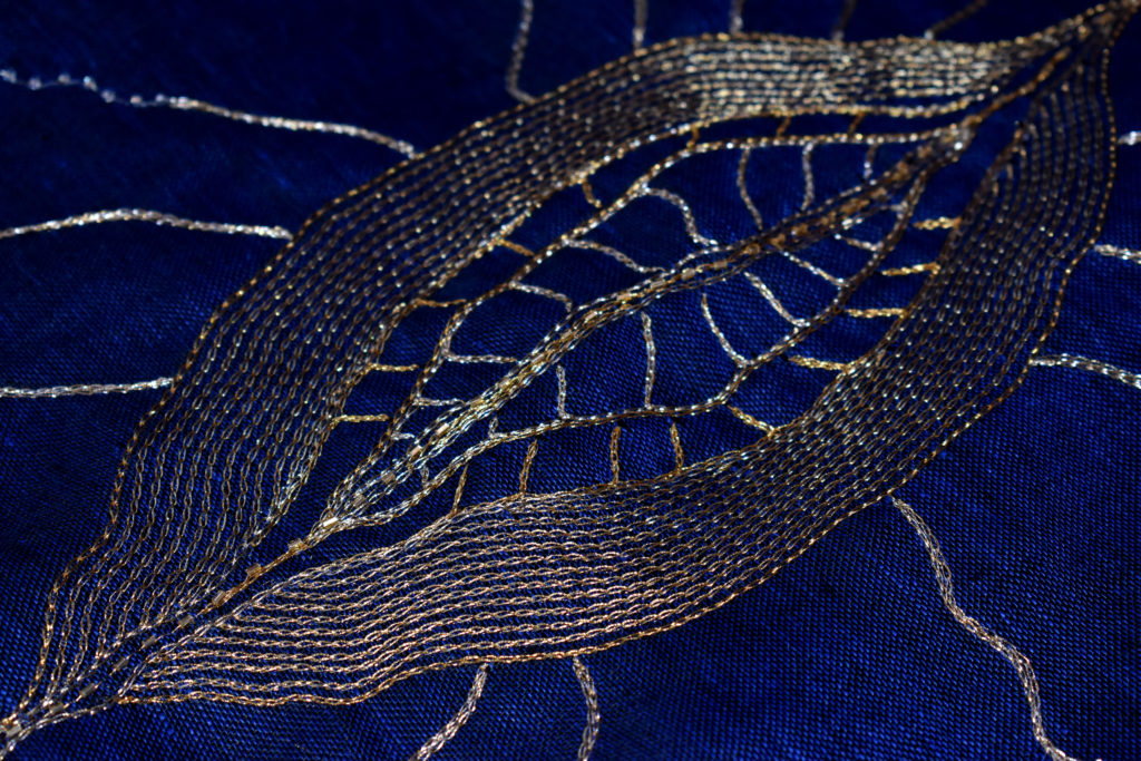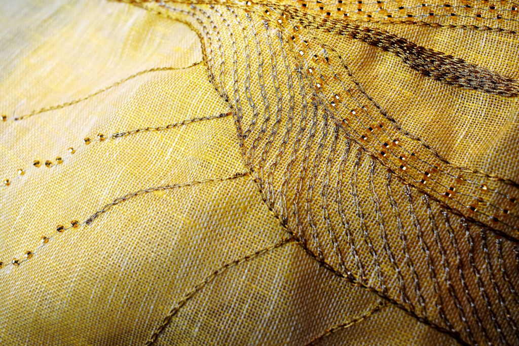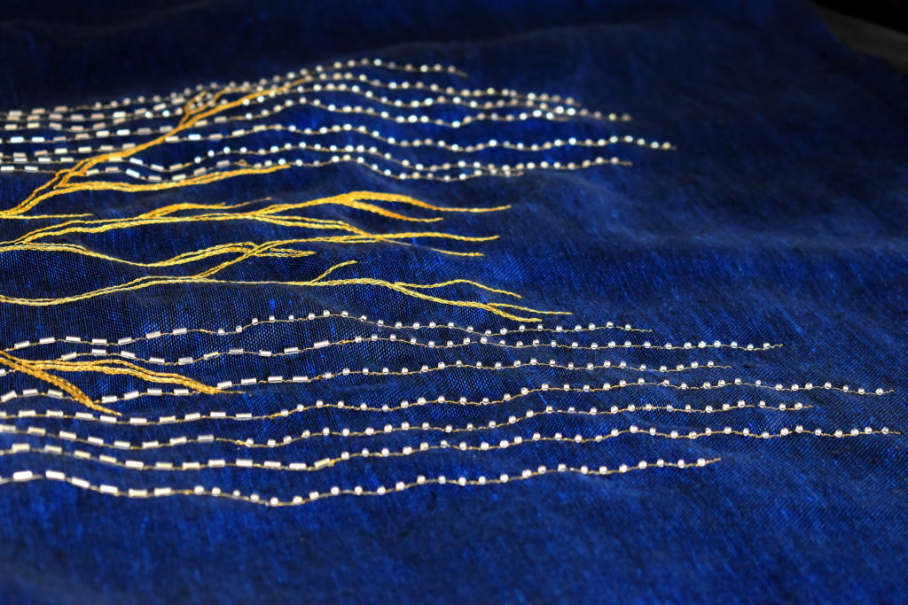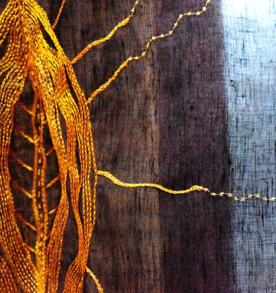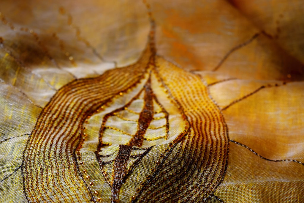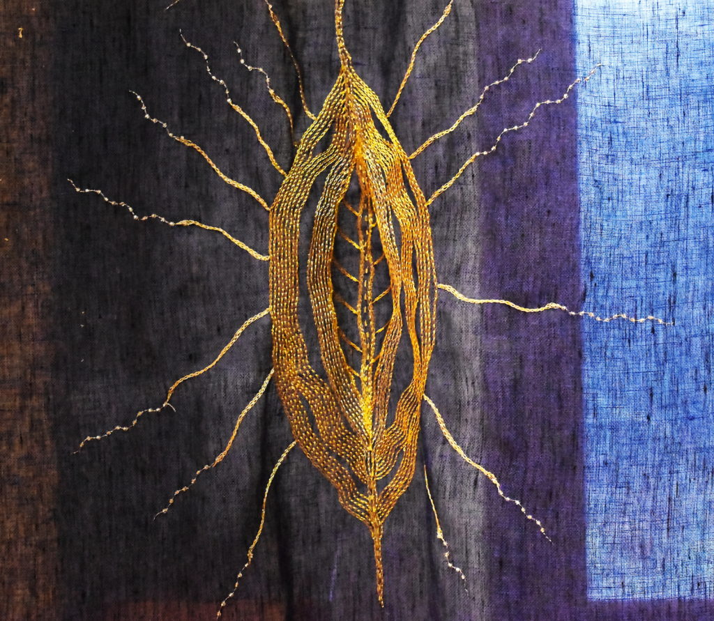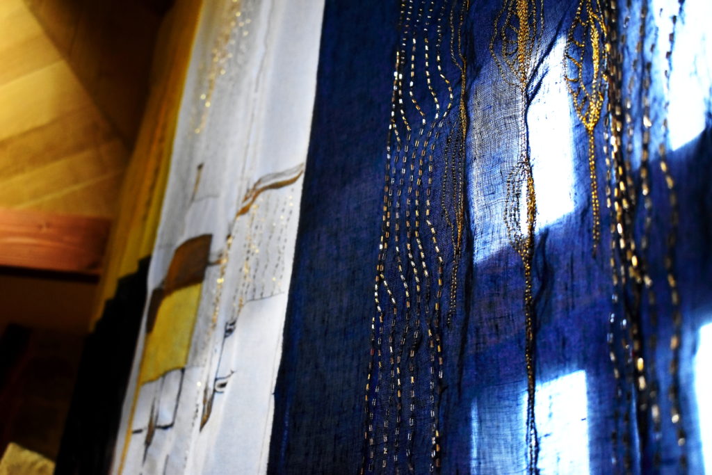 La broderie filtre la lumière à la manière d’un vitrail, et tisse des liens entre féminité et esthétiques catholiques et musulmanes. Celle-ci interagit avec la lumière naturelle : certaines broderies du “vitrail” apparaissent avec la tombée de la nuit, et d’autres se révèlent au regard lorsqu’il fait jour.