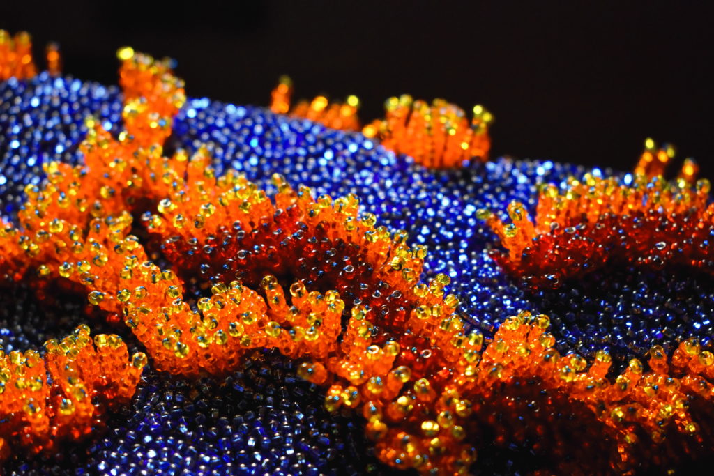 Cette fleur m’apparaît comme une orange sanguinolente, sublimée par les perles de verre, à la manière de la charogne de Baudelaire.